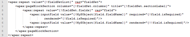 ●     Finally we need a visualforce page that will consume the list of field sets wrapped in the wrapper class mentioned in first point above and render the page accordingly. Code snippet for the visualforce page is given below,